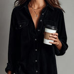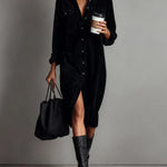 Удобна и стилна миди рокля, изработена от мек корд, с широка силуета, двойни джобове на гърдите и класически еднобутонен преден закопчаване. Перфектна за ежедневна носене с нотка на ретро чар.