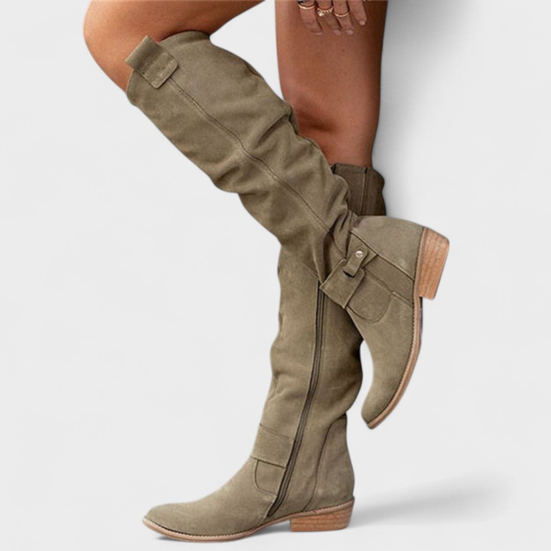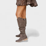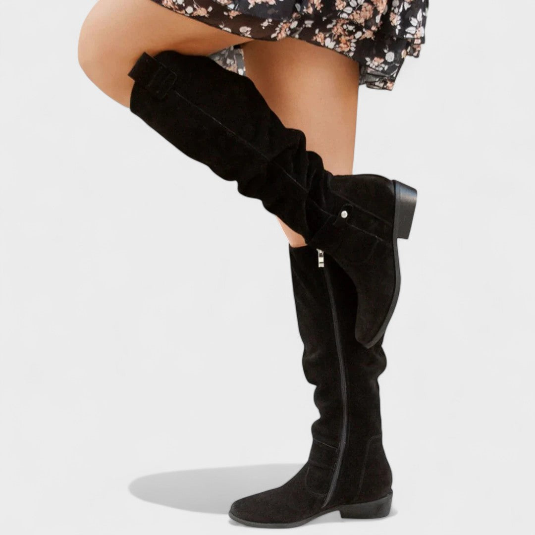 Тези високи ботуши носят градски шик и комфорт в една стъпка. Мекото, леко горнище с елегантни намачквания приляга плътно към крака и предлага отпуснат, изискан вид. Страничният цип позволява бързо обуване, докато ниският блоков ток предлага стабилност за целодневно носене. Субтилни детайли като декоративна катарама придават доза изтънченост, която лесно се съчетава с рокли, поли или дънки. Перфектни за работа, кафе в града или вечерно излизане.
