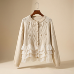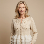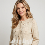 Повдигнете гардероба си с кардигана Огняна™, изящна комбинация от уютна плетена текстура и ефирни женствени детайли от шифон. Създаден за жената, която цени фината елегантност, този модел впечатлява с деликатни пом-плетени акценти, вълнообразен кант и каскадни волани, които добавят движение, мекота и романтичен чар. Независимо дали го съчетавате с дънки за небрежен ден или го наслоявате върху рокля за по-нежен и изискан стил, Огняна™ внася очарование във всеки момент.