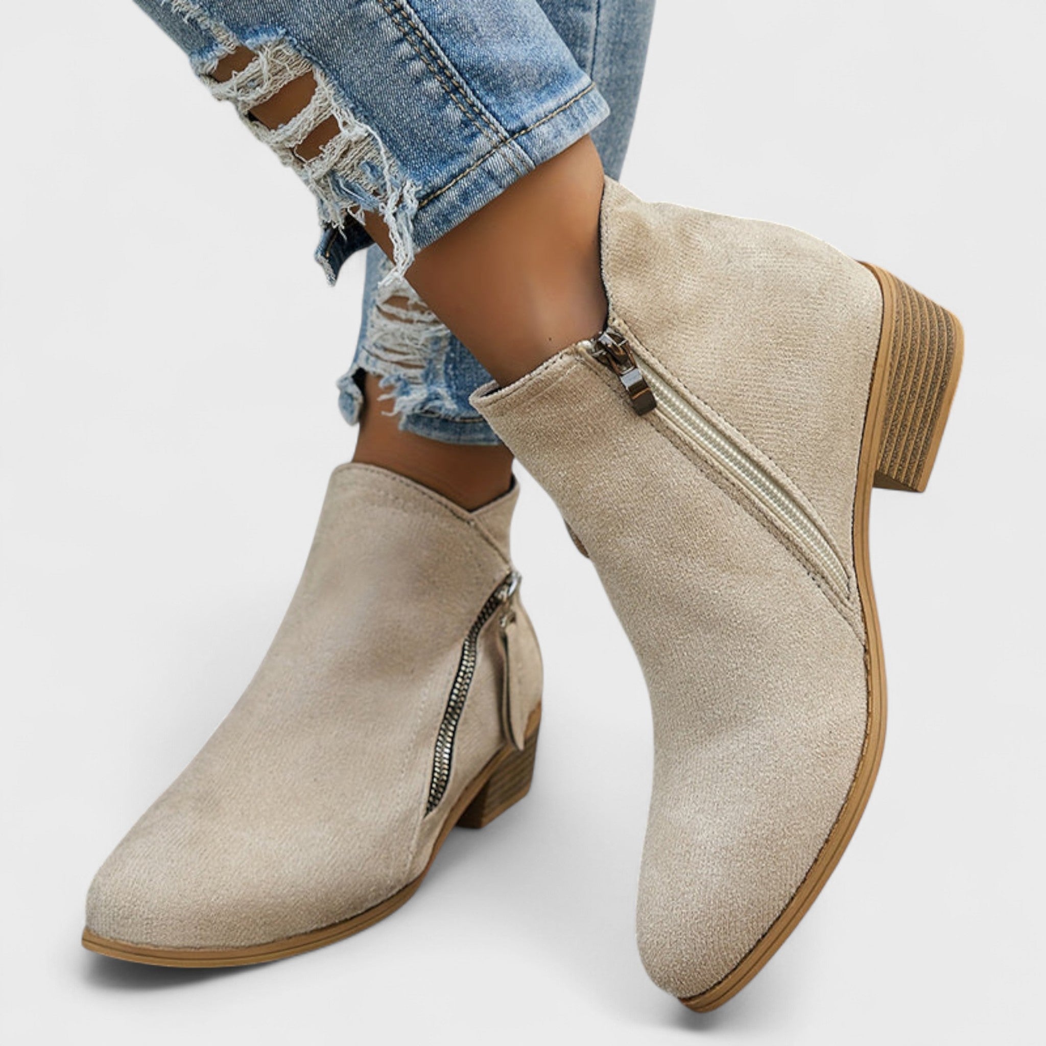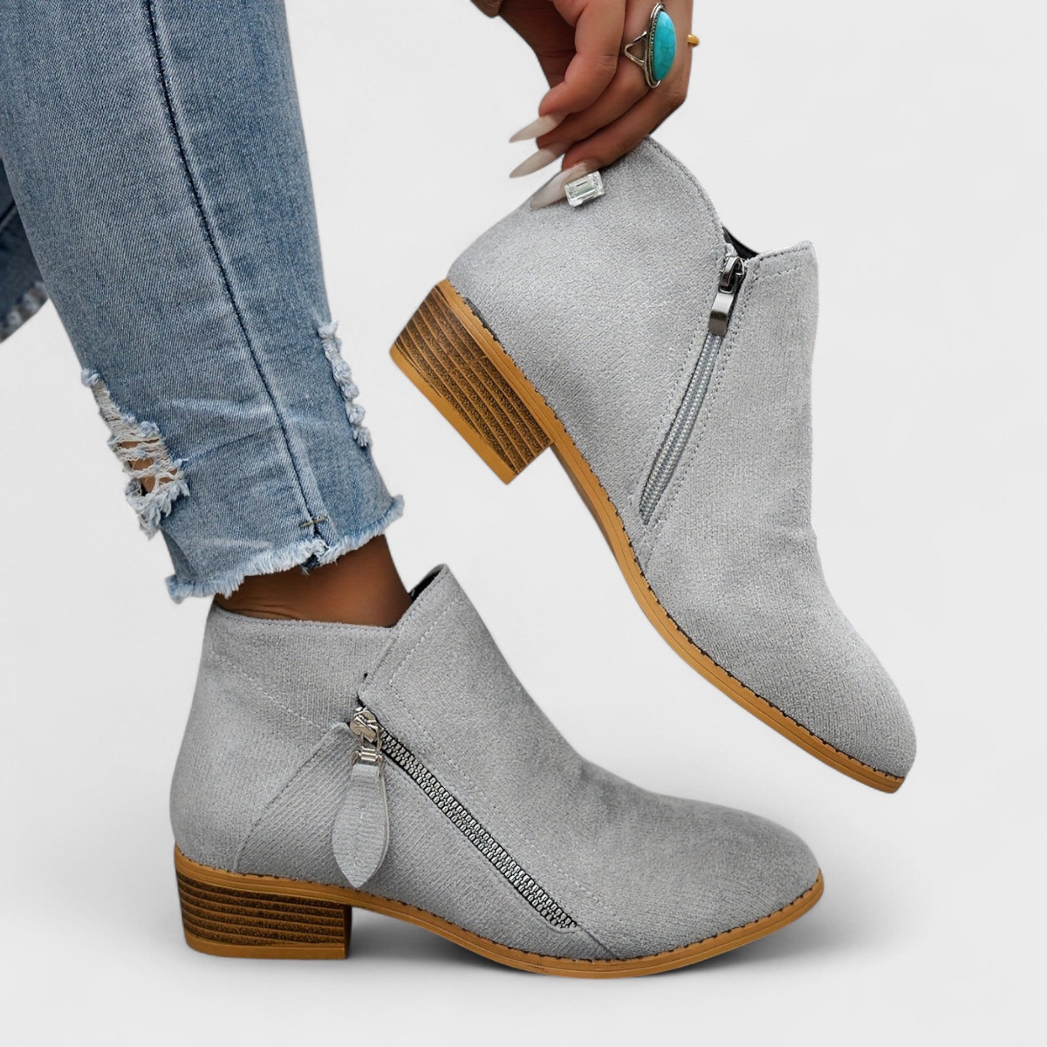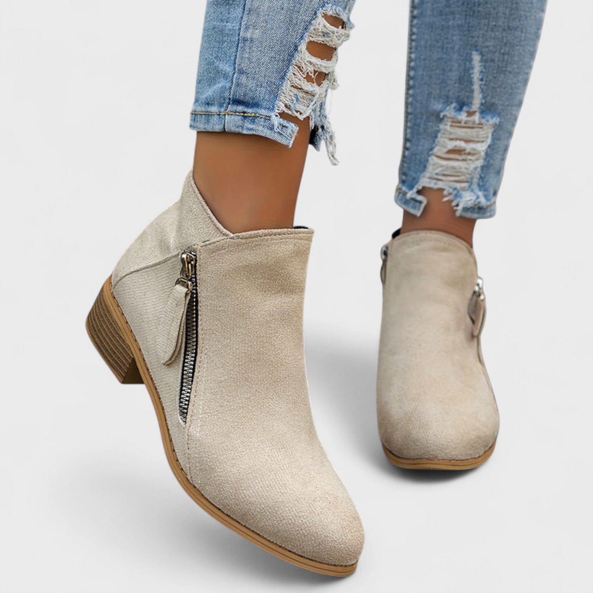 Дамски боти до глезена с страничен цип за бързо обуване и изчистена бадемова предна част. Мек велурен ефект на горната част, стабилен нисък ток и омекотена стелка осигуряват комфорт от сутрин до вечер. Нехлъзгаща подметка и прецизни шевове за завършен, модерен вид – перфектни към дънки, рокли и офис визии.