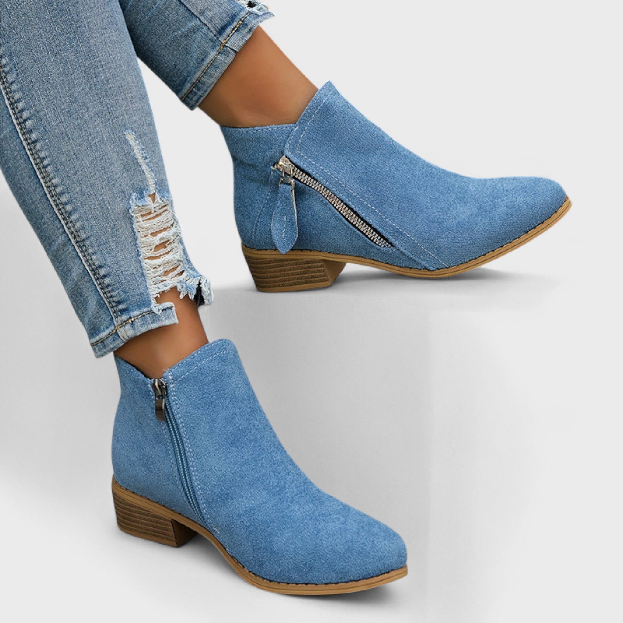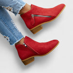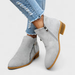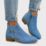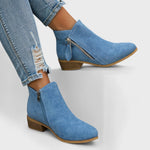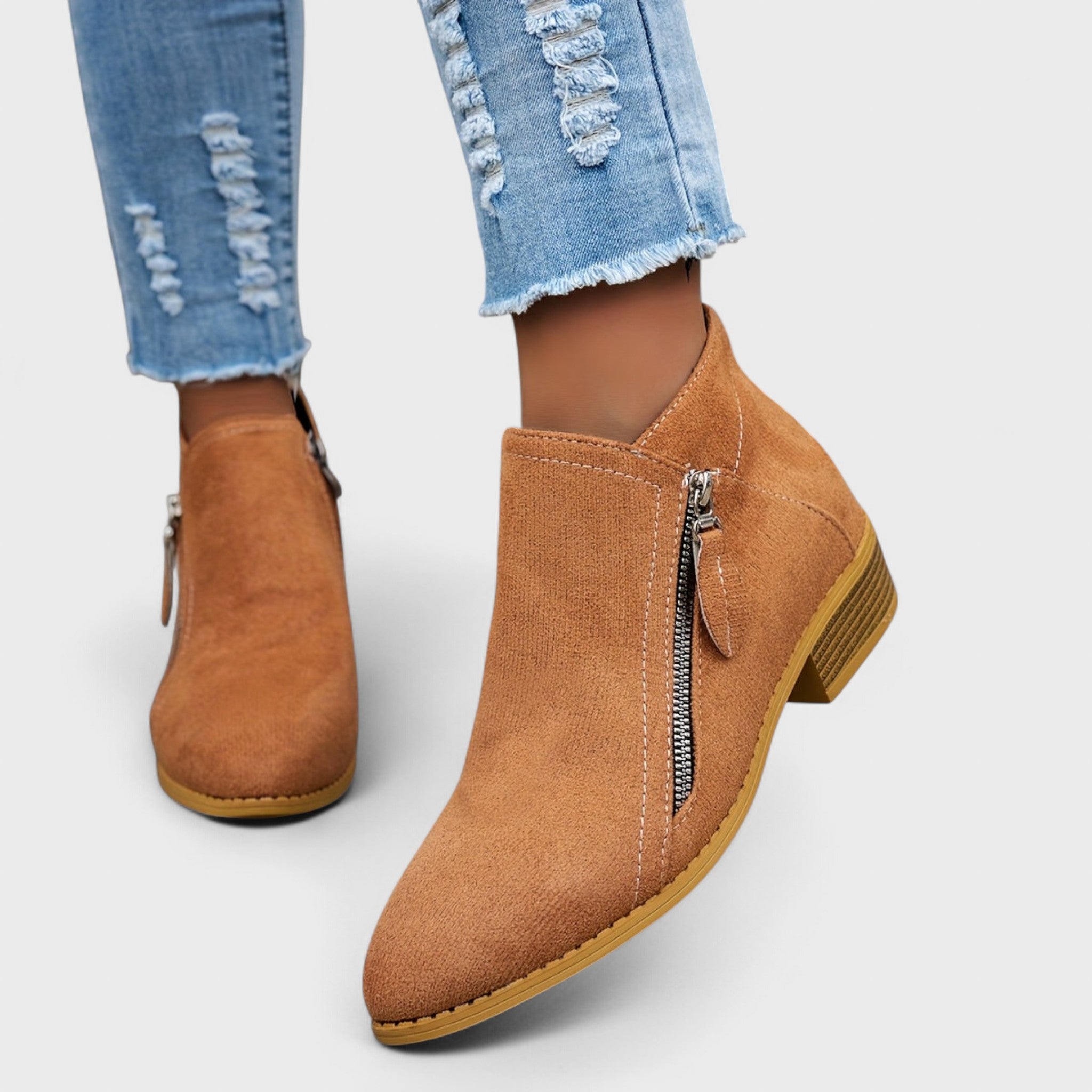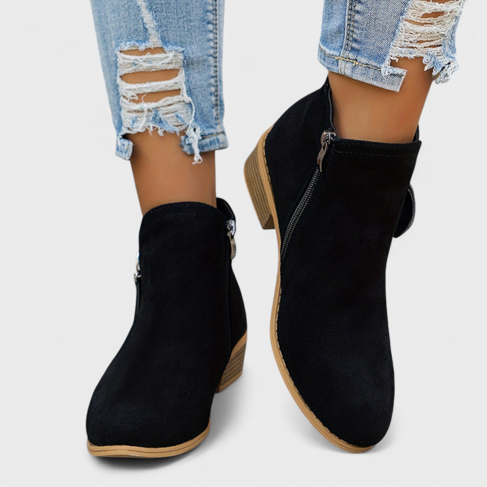 Дамски боти до глезена с страничен цип за бързо обуване и изчистена бадемова предна част. Мек велурен ефект на горната част, стабилен нисък ток и омекотена стелка осигуряват комфорт от сутрин до вечер. Нехлъзгаща подметка и прецизни шевове за завършен, модерен вид – перфектни към дънки, рокли и офис визии.